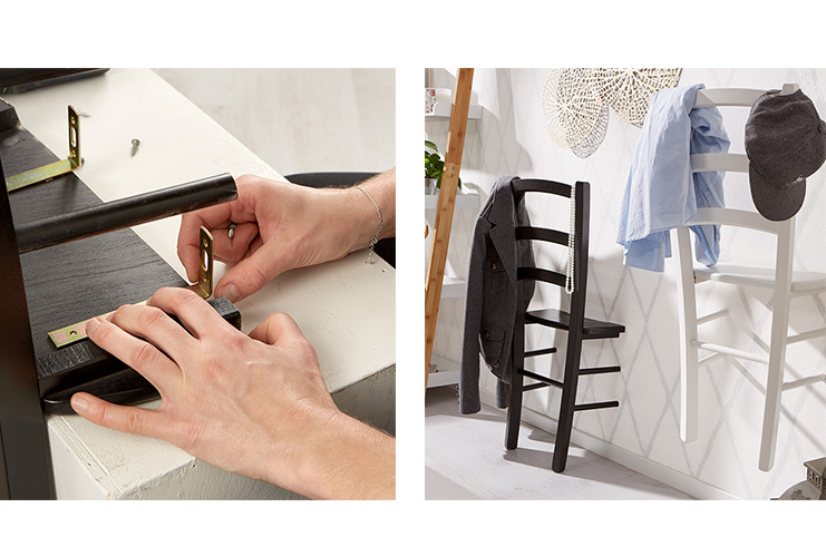 За да закрепим закачалката за стената, ще са ни нужни г-образни (или ъглови) планки и винтове. За един стол са необходими 2 планки и 4 винта. Така закачалката става стабилна и ще издържи на лавината от дрехи и аксесоари, която ще я залее