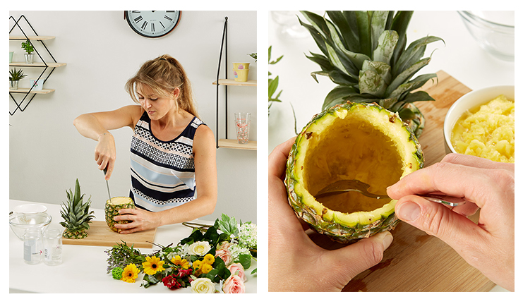 Щом вътрешността на плодовете е отстранена (чудесен повод да си направим мармалад от ананас или фреш от диня), вътре се поставя чаша или купичка с подходящ размер.