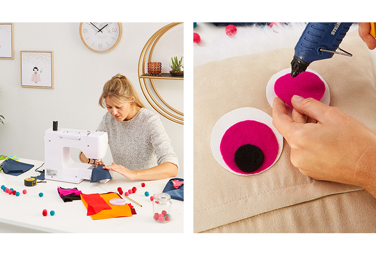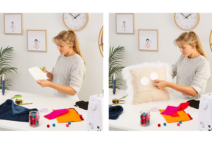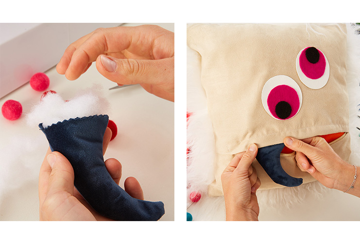Залепваме очите към възглавничката с помощта на горещо лепило и можем да започнем с устата на чудовището.
