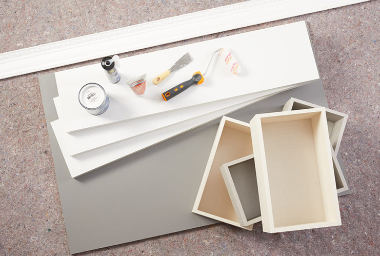 Първо се захващаме с основата. Тя се състои от полица за стена с размери 90x25x5 см. Върху нея, в двата края залепваме по 2 етажерки с размери 23x25x46 см. Внимаваме отворите на етажерките да са отстрани, за да може по-късно да се използват като място за книги и декорация