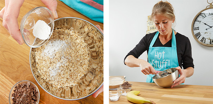 Първо загряваме фурната на 150 ° C и подготвяме тава с хартия за печене. Нужни са ни 2 купи (голяма и средна). Смесваме брашното, овесените ядки, бакпулвера, шоколадовите калети и солта в голямата купа.