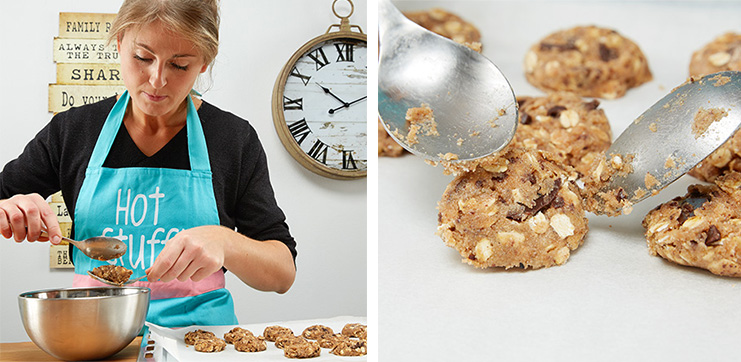 И така, течната маса в средната купа добавяме в голямата купа и разбъркваме всичко отново добре. С помощта на 2 супени лъжици оформяме сладките, нареждаме ги върху хартията за печене и ги леко ги притискаме с опакото на лъжицата.