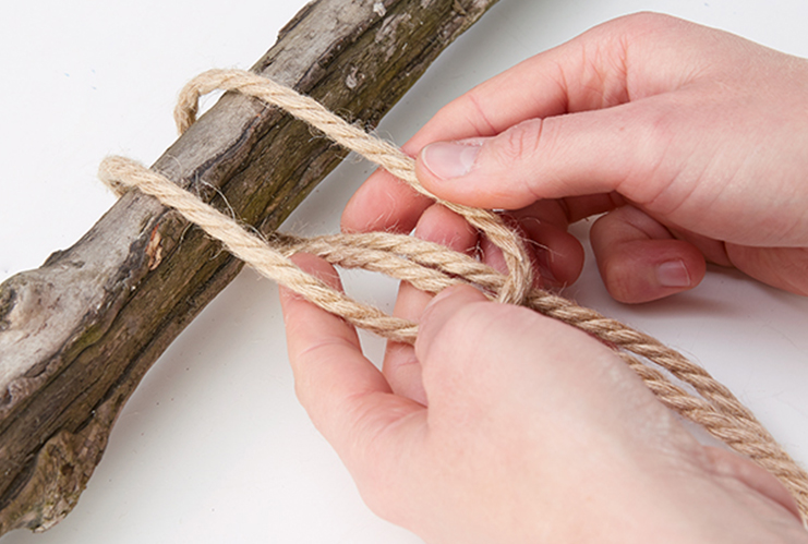 С всеки конец се прави примка около дървената халка, като двата края на конеца минават през примката отдолу под халката и се затягат.