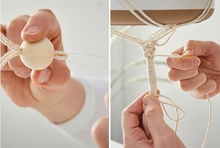 Между възелите можеш да включиш и дървени топчета (за да ги нанижеш лесно на преждата, използвай рибарска корда като на снимката). Можеш да продължиш плетката по твои вкус и желание. Другите две снопчета се сплитат аналогично на първото. За да направиш накрая място за кашпата, трябва да сплетеш отделните конци с прави възли.