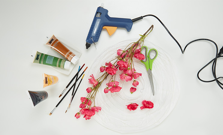 Щом клонките са готови, ги оставяме да изсъхнат добре. През това време можем да си подготвим цветчетата, като ги отрежем от дръжките. Накрая залепваме цветовете за хартиения лампион с помощта на горещо лепило.