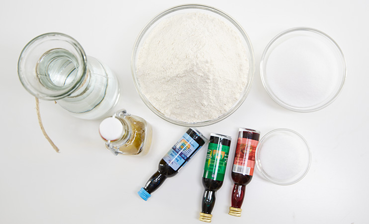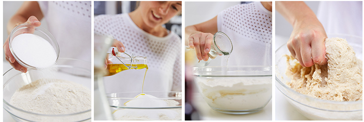 Първо смесваме брашното и захарта в голяма купа. След това добавяме олиото и лимоновата киселина и разбъркваме. Накрая внимателно наливаме водата и замесваме тесто.