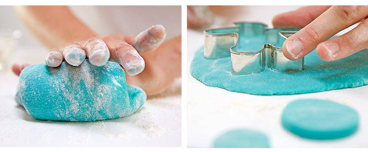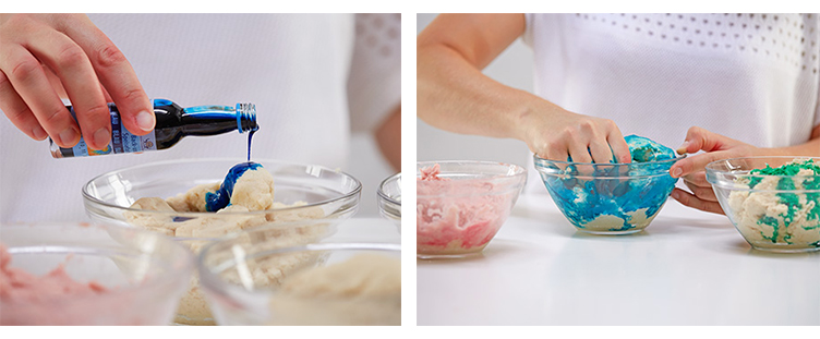 Тестото се меси докато стане меко и еластично и се отделя лесно от купата. Разделяме тестото на няколко части и го поставяме в отделни съдове, в зависимост от броя цветове, които искаме да направим. Добавяме избрания цвят и отново размесваме, докато се поеме цветът.