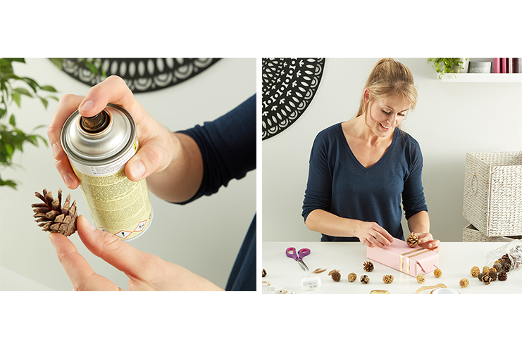 Идея 2: Подаръчна опаковка със златисти шишарки