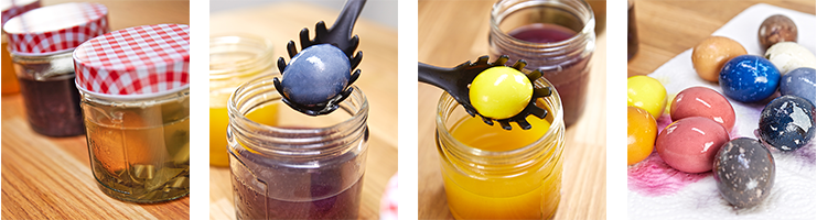 Като изминат 20-те минути, изваждаме яйцата и ги поставяме в огнеупорен съд (например буркан). Добавяме и течност от тенджерата, колкото да покрие добре яйцата. Накрая прибавяме и една щедра лъжица оцет. Ако съдът има капак, можем да го затворим и да оставим яйцата да поемат цвета поне за 4 часа (най-добре за една нощ). Колкото по-дълго стои яйцето в отварата, толкова по-наситен цвят ще придобие.
