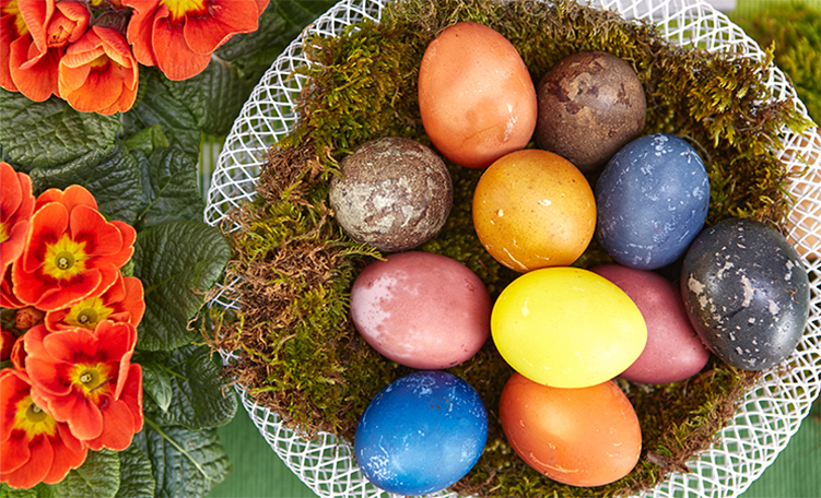 В тенджера наливаме вода (големината на тенджерата зависи от броя на яйцата, които искаме да боядисаме) и я остаяме да заври. Избираме си една от природните сътавки (ако е нужно, се нарязва) я добавяме в тенджерата. Всеки цвят трябва да е в отделен съд. Добавяме яйцата и ги оставяме така 20 мин. на много слаб огън (водата не трябва да ври силно).